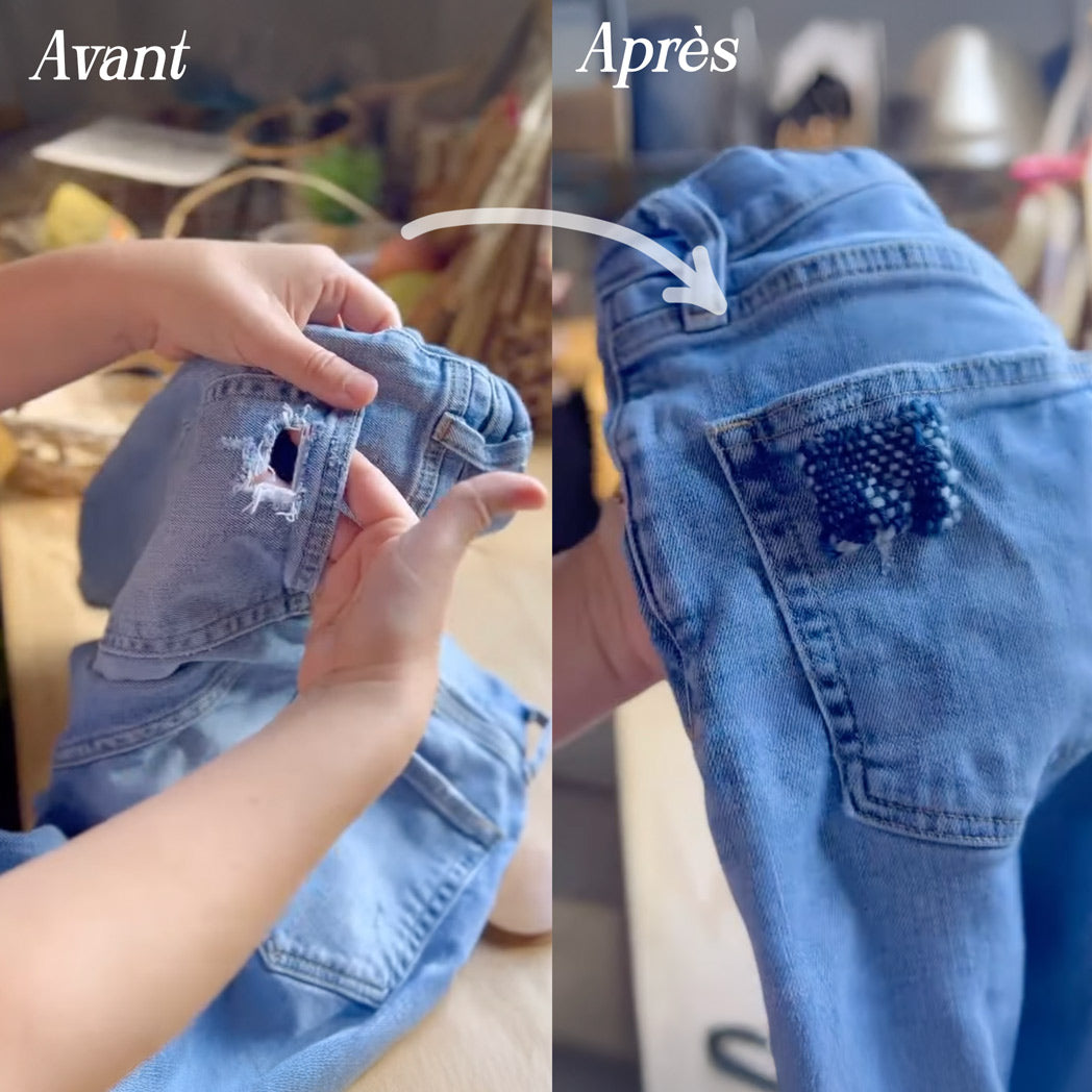 đ° Ăconomies rĂ©elles : Un jean neuf coĂ»te 80âŹ. Une rĂ©paration TricoPatch, quelques centimes de fil.